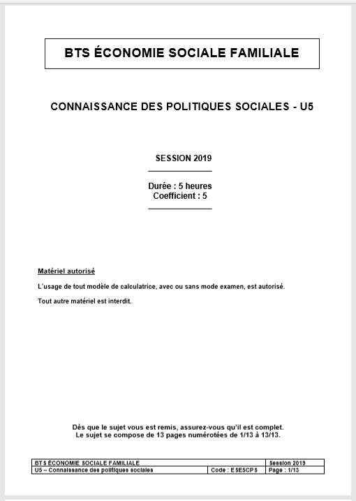 - Sujet 2019 - Métropole : CONNAISSANCE DES POLITIQUES SOCIALES - U5 :