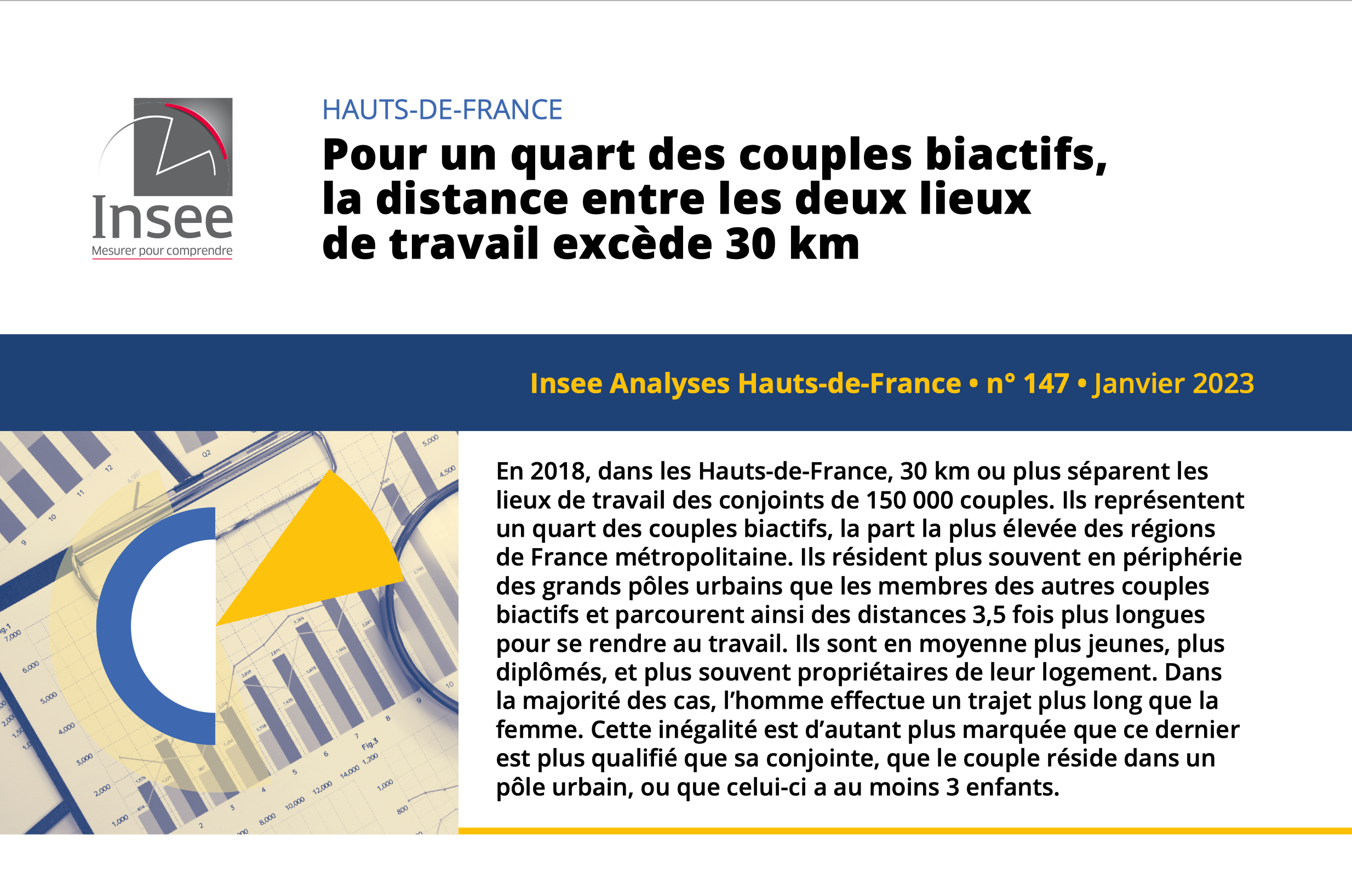 En 2018, dans les Hauts-de-France, 30 km ou plus séparent les lieux de travail des conjoints de (...)