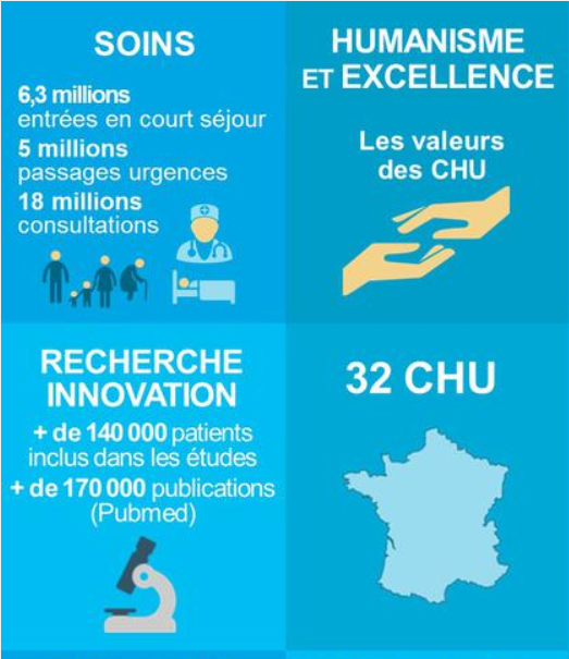 En 2017, les 32 CHU de France ont enregistré 5 millions de passages aux urgences, 6,3 millions d'entrées hospitalisation de court séjour et 18 millions de consultations.