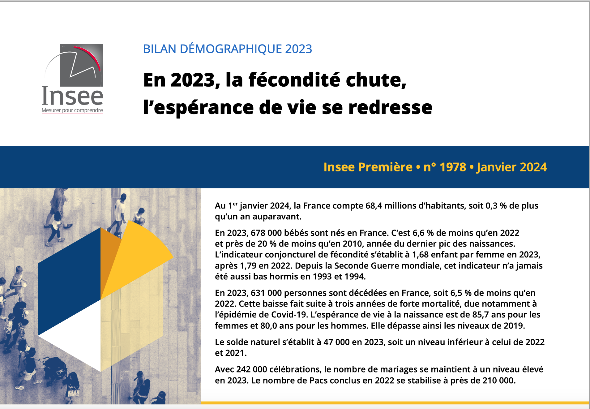 En 2023, la fécondité chute, l’espérance de vie se redresse. Au 1er janvier 2024, la France compte (...)